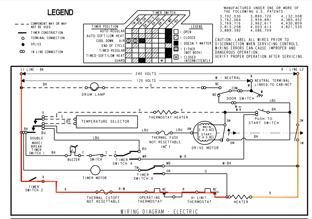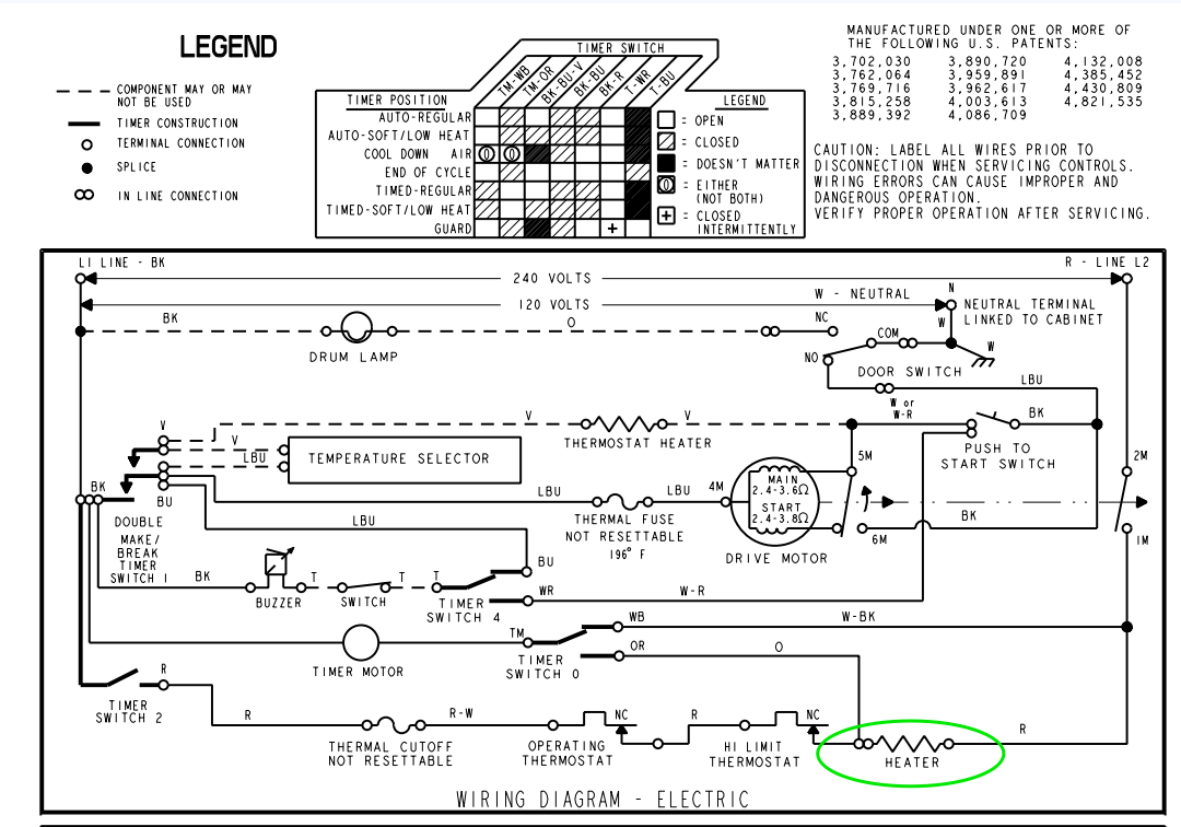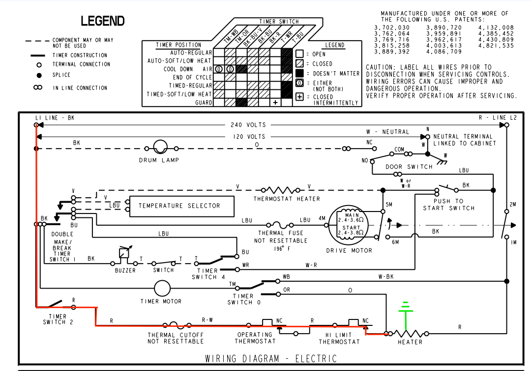 As that chart shows, BK - R is closed whenever any cycle with heat is selected, whether it's timed dry or auto dry. And that makes sense -- the heater doesn't have a complete circuit unless that switch is closed.