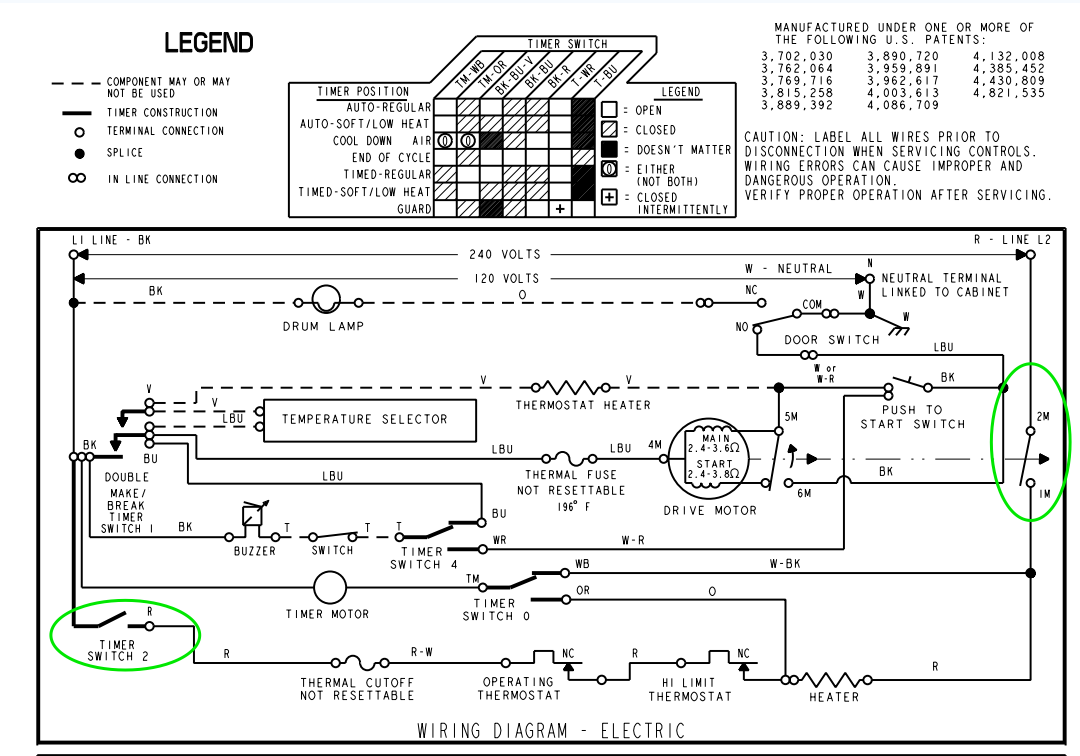 First, the timer. As soon as you turn the timer knob to select a cycle, certain switches in that timer will close. To tell which ones, we have to look at the timer chart at the top of the tech sheet.