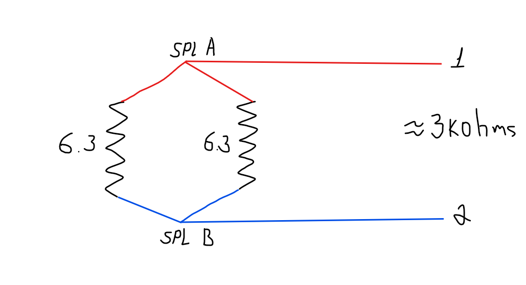 Slav Posted August 27 If you redraw those splices, it becomes easier to see that they are in a parallel circuit. That means the total resistance should be about half the smallest resistor (without using the formula). Since they are both 6.3 kohms, I'd say the total should be about 3 kohms. 3