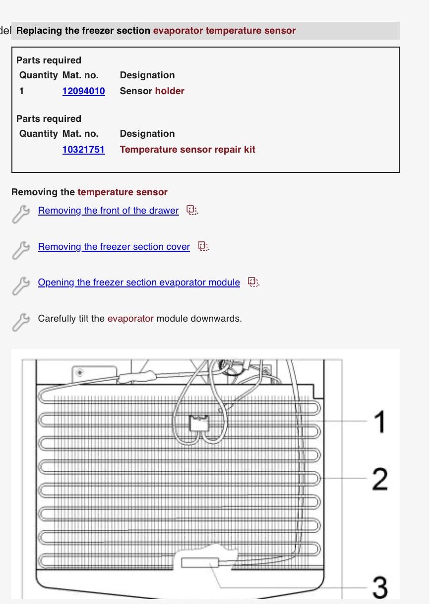 There is a bulletin to relocated the evaporator sensor. Original location was to low on the evaporator causing incomplete defrost. Liebherr had this issue for several years. You don’t want to remove the old sensor, just cut the harness and leave it in the evaporator. Messing with the evaporator isn’t fun and it’ll make you never want to touch it again. Very sketchy. - Last week